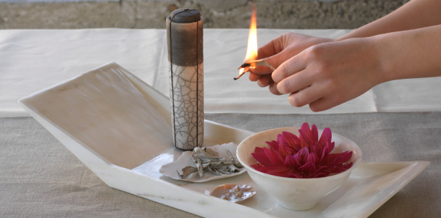 Raku Vessel: Kate Schuricht, Kent, England. Custom Irish Linen Runner.
