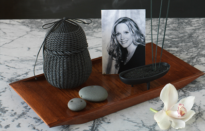Rosewood tray: Red & Green Company, Dandelion ; Custom urn basket: unavailable; Japanese cast iron 3-Legged Burner: Scents of Japan; Hand-picked hole embedded stones: from Lake Huron, MI